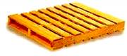 This two way design, double wing pallet is reversible and thus has the same amount of top and bottom deck boards. Due to the extension of the deck boards beyond the stringers, it is often referred to as the strongest pallet design.